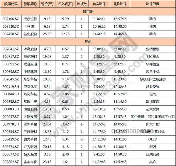盘面上,中国保利集团有限公司与中国中丝集团有限公司实施重组,久联发展(002037)直线封板;养殖板块小幅上涨飘红,天康生物(002100)涨停,得利斯(002330)、德美化工(002054)大幅拉升;农业股午后拉升,敦煌种业(600354)冲击涨停;ETC概念出现分化,华信新材(300717)、星帅尔(002860)涨停。ST板块走弱,*ST节能(000820)等近20股跌停。个股方面,新城控股(601155)一字跌停,博信股份(600083)午后上演“地天板”走势,盘中一度涨停。