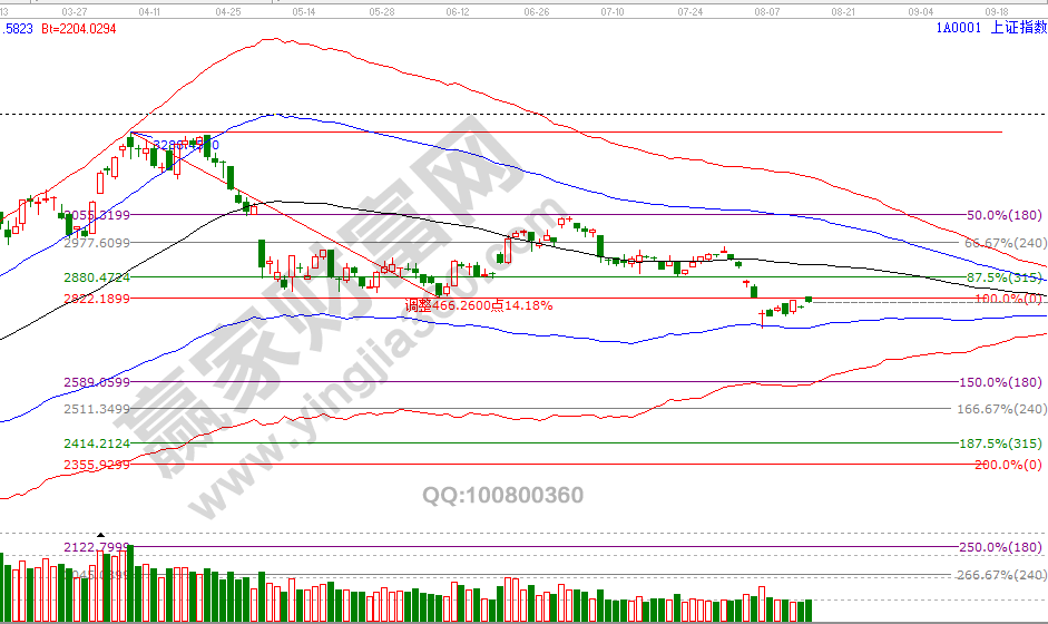 6号开盘前赢家江恩系统VIP学员区发周期共振图,指数触及极反通道蓝色下轨线2744点后激进者开仓,并于当天收盘分析中给出反抽目标位是波段百分比延伸线180度2834附近,今日指数高开上攻正好到13号分析的反压位2829点回落,学员区继12号提示分批第一次减仓获利后,今日早盘触及15分钟蓝色上轨线再度做图分析达到获利了结条件。随着时间窗口、目标价临近,代表价格将再会进入一次较大波动期,另外早盘谈到科技股短期高点形成,激进者剩余最后一批仓可以以百分比延伸线120度2791为参考线。8月15号盘中压力是225度2815点、270度2829点,盘中支撑是135度2786点、90度2772点,本周五日线时间窗口。操作策略,指数生命线下弱势区运行,激进者3成仓交易,稳健者空仓休息。