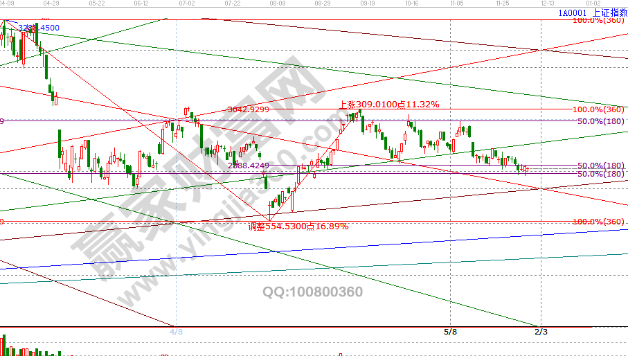 指数早盘触及江恩箱3/8空间分割位2870点止跌,全天围绕下降1*1线震荡,随着时间窗6号临近,市场盘中震幅收敛到极致方向选择在即,空间上,指数向上突破3*2线2914点则顺势做多,反之如跌破2870点快速下行挖坑,在江恩箱2*1线2810支撑寻找机会,5、6号两个交易日重点跟踪方向选择,跟随市场做好仓位应对。5号盘中压力2894、2911点,盘中支撑2860-2870位置。操作策略,指数生命线下弱势区域,仓位控制在3成,稳健者重点关注12月6号时间窗口机会。