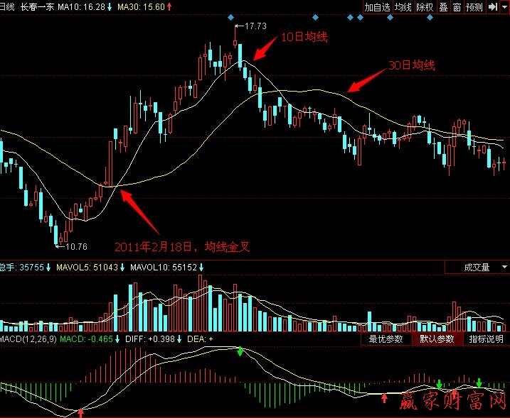 2月18日,10日均线成功突破30日均线,此时30日均线已经开始上涨。二者形成了均线金叉形态。这个形态说明随着股价不断上涨,短期内的交易价格已经超过长期交易价格。此时上涨趁势已经形成,并且未来股价的上涨速度还可能会越来越快。此时买入时机出现。