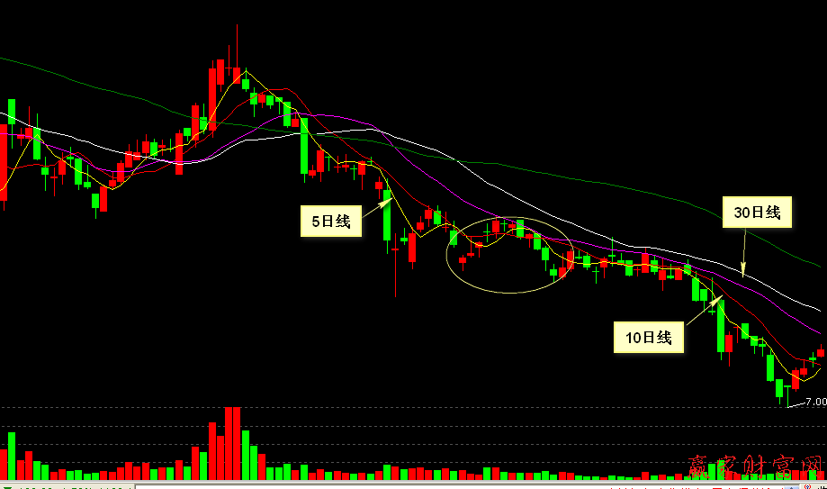 从图中我们可以看出:该股在5日、10日、30日均线形成了空头排列的情况下,以小阴小阳的形式持续缓慢的向下跌落,使得逢低吸丑的投资者全线被套,十分无奈。5日、10日、30日均线就像是三座大山一般将多方压的透不过气来。投资者能够越早跳出来,损失就会越小。