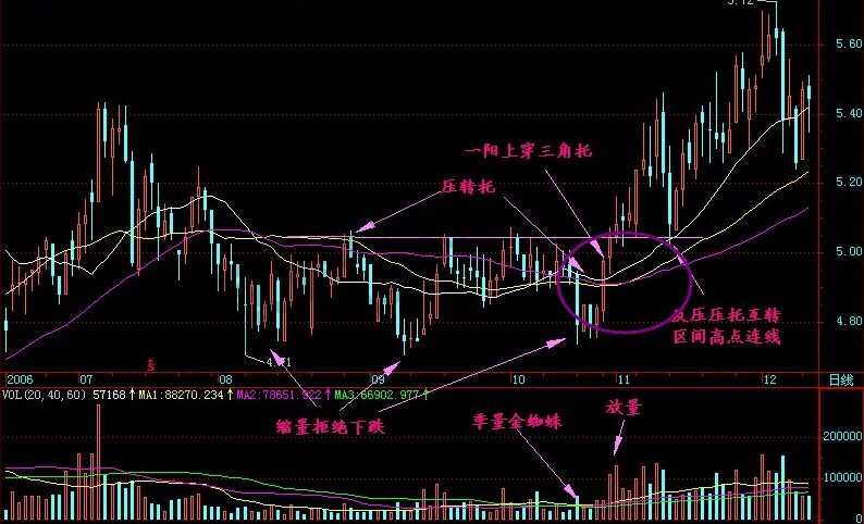 图中可以看到在均线季价托的同时还有一个出水芙蓉形态。其中的价托是由均线为20日均线、40日均线以及60日均线所组成的。上图中黄色的为40日均线,白色均线为20日均线,紫色的则为60日均线。图中,两组压托互换的过程中,还形成了量芝麻点,底部被抬高,当很显然是主力庄家在背后收集筹码蓄势待发。接下来我们总结一下一样上穿三角托的特征以及意义