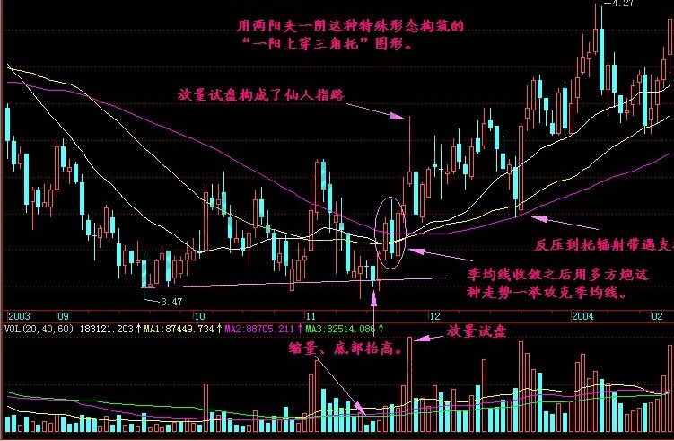 笔者重复一点:当一阳上穿价托的时候,在结合其他底部反转的形态例如多方炮、“两样夹一阴”与“芙蓉出水”“仙人指路”等这种典型预示上涨行情的形态出现,就是买入的好时机。