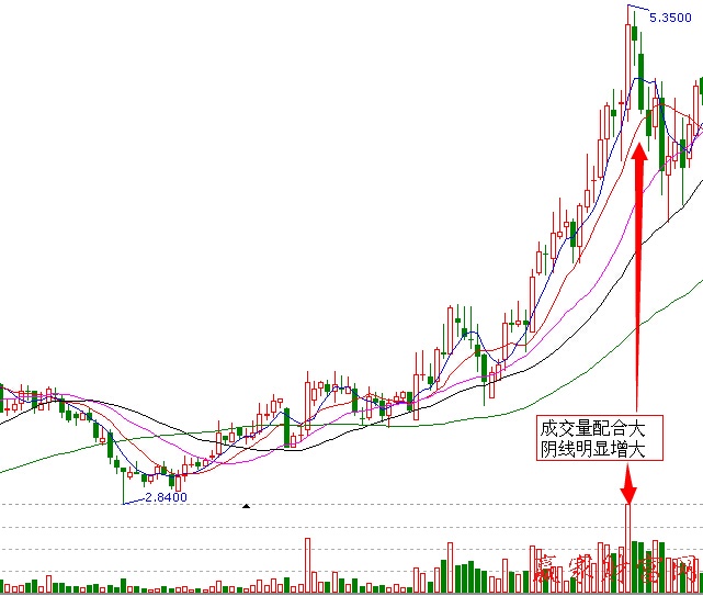市场中普遍认为股价在上涨时出现放量,说明做多的能量是比较充足的,是庄家拉升的表现。而如果股价在下跌过程中出现放量,则是主力在进行出货的标志。但是主力在洗盘过程中,也常常故意制造放量收大阴线的形势,因为主力机构有强大的控盘能力,筹码数量占优绝对的又是,因此可以通过对倒的形式来制造巨大的成交量,这样可以起到震慑散户的效果,让更多的散户认为主力机构正在大举离场,从而提前离场。