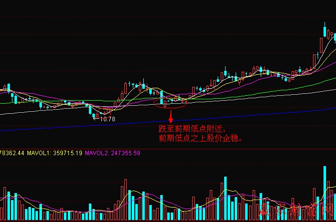 如下图实例中个股跌倒前期低点企稳止跌: