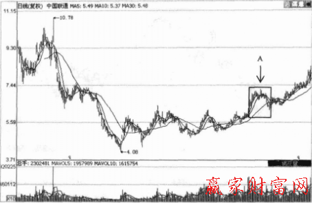 如果股价己经过大幅下跌,然后在底部震荡上行时出现了圆顶,这时投资者不能想当然地按圆顶的操作方法来操作。如图所示是中国联通(600050)的日K线图。该股的股价经过快速大幅下跌后开始震荡上行,这时出现了圆顶形态。