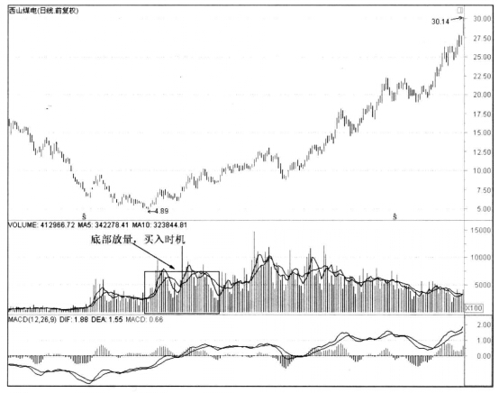 图1为西山煤电的日K线图。该股的股价在见底之后开始不断的放量,股价的重心不断的提高,说明了庄家是已经有一定的控盘的能力拉升行情即将展开的。该股启动后,涨幅巨大。