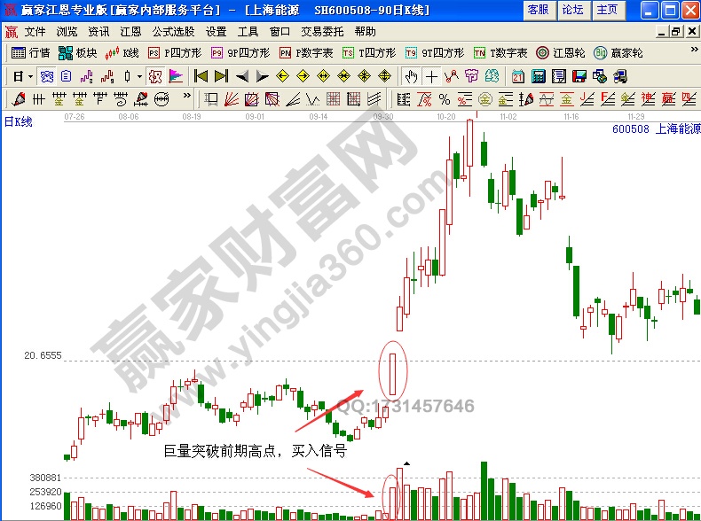 图2为上海能源的日K线图该股当日放出了最近一个月的最高成交量,买方来势汹涌,解放了前期高点的所有套牢盘。拉升的行情迫在眉睫,该股在随后11个交易日里涨幅超过30%。