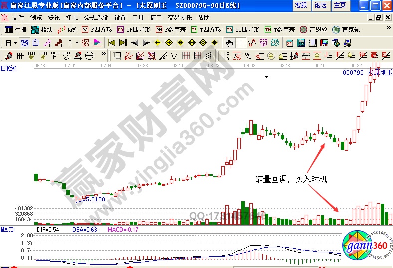 图3为太原刚玉日K线图。该股前期有一波快速的拉升,然后开始回调,回调的幅度是在20%左右.量能不断萎缩,说明了庄家并没有出货,随后股价再次的上涨涨幅翻倍。