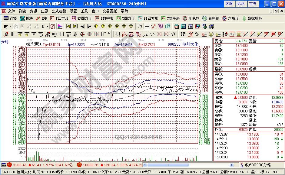 包含5条线:黑色生命线,蓝、红两条外轨线,如下图。将股价分位4个通道:超强通道、强势通道、弱势通道、超弱通道,我们可以通过站稳一线看高一线;跌破一线看低一线;一线不过回调一线,是短线、波段以及中长线操作很好用的工具。