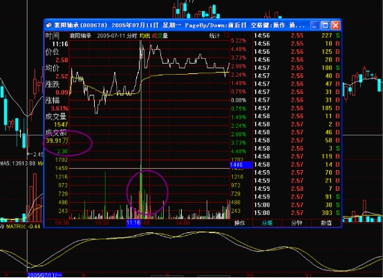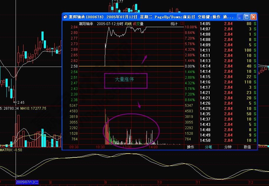 如上图所示,该股在2005年7月12日的时候,出现了大量涨停的情况,当天该股报收于2.84元的涨停价,日成交达到793万股。当时100天的平均成交量是75万股,50天的平均成交量是85万股(赢家财富网),因此当天的成交量已经达到平均值的10倍,而它的流通盘仅仅只有不到8000万股!这可以说是明显的放巨量涨停案例。