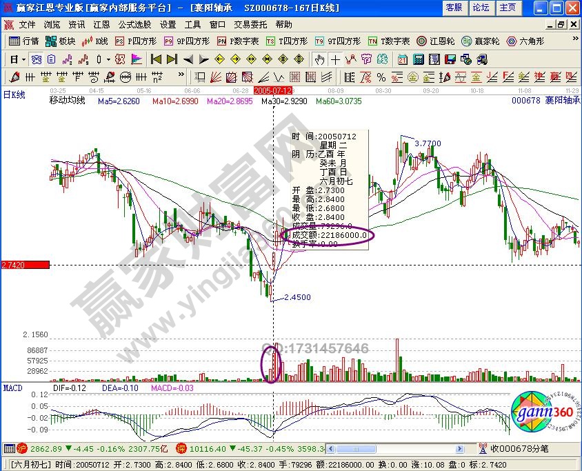 基本面上该股当天公告今年中报的业绩达到去年同期的10倍。仔细分析,2004中报0.006元,因此2005中报应该是0.06元。根据公司有关公告,早在数月前公司就称今年的业绩将翻倍,而2004的业绩是0.078元。因此2005的中报业绩应该早就被市场所知晓,这一则公告绝不会引来那么大的买盘www.yingjia360.com,更何况该股刚刚在前一天创出了2.45元的历史性低价,因此在目前的价位绝对不可能出现那么多的抛盘。显然这一成交量并非真正的市场所为。