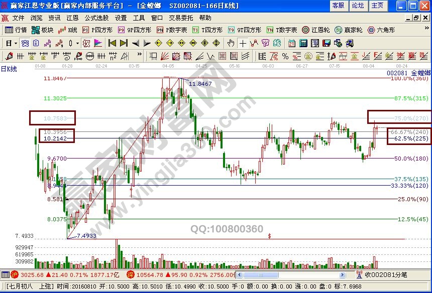 这里首先强调一下,价格工具不仅仅只有波段百分比工具,这里就以百分比工具为例来进行讲解,图中我们看到我们以近期已经走完的波段进行高点低点的选取,作出,看出该股近期的压力位是75%的位置,也就是10.7583元,近期的支撑位10.3956元如果跌破那么第二支撑就为10.2142元,那么稳健的支撑我们可以以9.67元作为支撑。它的核心与极反通道的指标的核心是一样的,站稳一线看高一线。