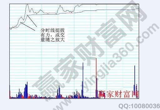 股价在开盘之后就形成一个明显上升通道,此时分时线走势比较曲折,不宜短线操作,因为此时不管是量能变化还是分时线运行方向,都没有明显强势特征。只有当股价突破上升通道上轨时,分时线走势强劲,投资者可在此时买入。