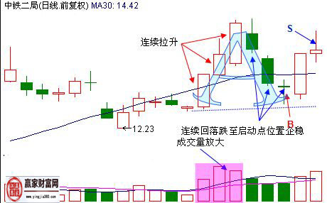 个股先经过了主力资金抢筹,之后持续上涨,然后是展开了一波的拉升行情,紧接着随着短线资金获利出局,主力顺势洗盘,股价随后进行回落,并跌至启动点的位置,如下中铁二局的走势图所示。