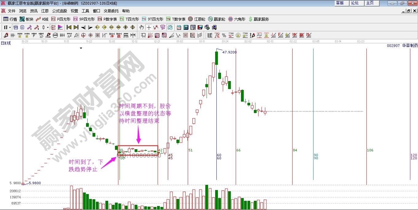 时间,江恩认为时间是决定市场走势最重要的因素。市场涨跌存在着时间关系,或是倍数或是分割比率,找到时间周期变化规律能更有效的辅助投资者把握进出市场时机,提高资金利用率,占尽市场先机,所以当时间没有调整结束,即使股价和成交量调整到位,股价也是迟迟不涨的。造成这个现象的原因有两个:1.市场整体趋势还没有结束调整周期;2.市场主流热点没有轮到该板块。对于这类的股票,就是“万事俱备,只欠时间”,对于波段、中长线投资者来讲,只要耐得住寂寞,就可以放心的逢低买进,等待时间到来一飞冲天。