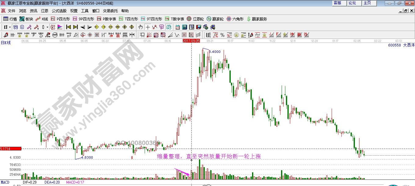 2. 洗盘结束之前成交量会有缩量再放量的特征,部分主力在洗盘中会将股价控制在一个相对狭窄的区间反复震荡整理,这期间成交量会明显缩减,直至某一天成交量放大,就说明主力洗盘结束,即将开始新的上涨行情。