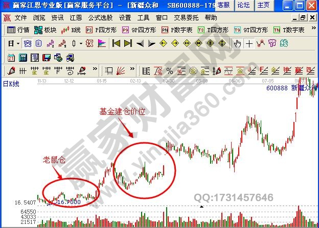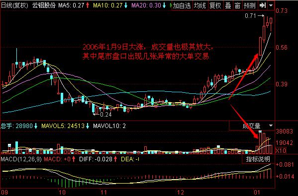 (3)为了判断主力是否有出货的量能,必须参考成交量。如果在上冲过程中量能放得过大过快,就要当心主力是否在出货,如果量能处于温和状态,那么,“老鼠仓”形的K线走势的最后一个技术条件也成立了。