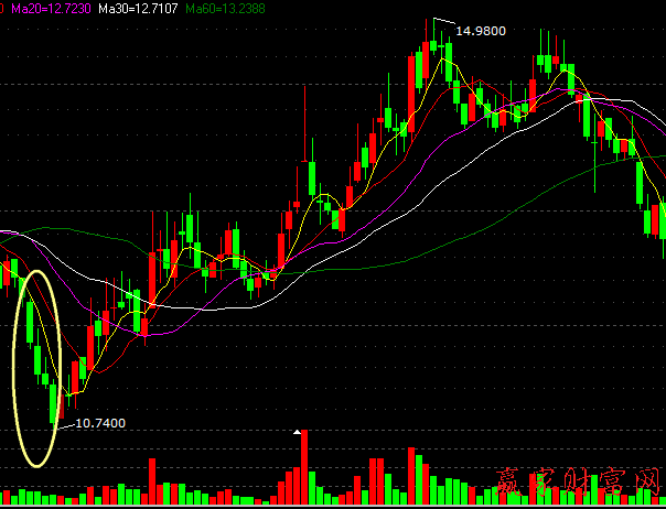 一、股价处于底部阶段的时候,K线的走势当中呈现几日连续的高开低走,连着出现5条不断下跌的阴线,甚至更多,从表面上看起来行情很不好的样子。实际上它们的下跌趋势并不是很大,股价也没有跌多少,甚至还会有所回升。