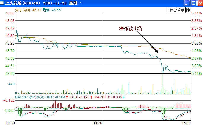 以上就是遇到瀑布波形的实战操作策略,当然如果遇到如下诱杀出货的K线形态的时候,投资者也要会进行实战分析,海航投资(000616)在2007年11月26日的股价走势,(来源于赢家财富网,转载请注明出处,www.yingjia360.com)这个时候股价已经运行在中期下跌空头的形态,说明震荡杀跌是后市的主要走势,而成交量急剧的放大,主力出货比较急切,短中线要以观望为主。
