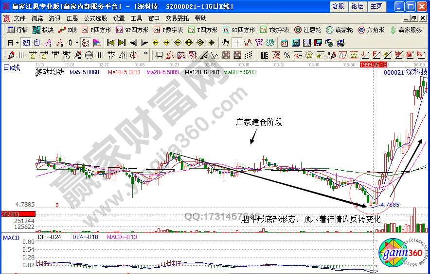 如图深科技在1999年1月到6月的股价走势变化,主力在股价震荡区域进行底部震荡建仓,并且不断的吸收筹码,在经过一段时间的下跌之后,股价快速的形成底部,而且不再创出新低,形成了烟斗形底部形态,这个时候要结合均线的技术进行分析,在股价放量站上60日线的时候就是投资者积极建仓的关键点位。