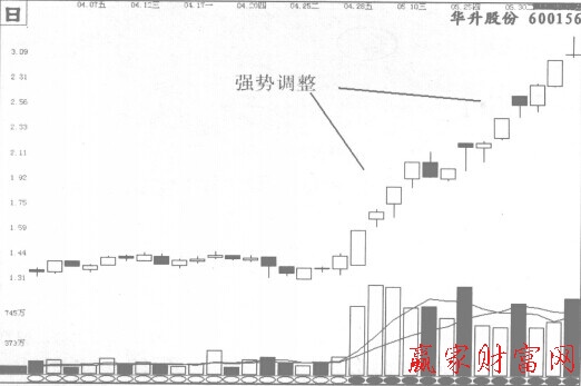 第一根涨停大阳线出现后,股价出现了调整走势,虽然K线图中显示的调整性质比较明显,但是,每一次调整出现时,调整的幅度都非常小。这种走势说明,虽然股价的波动性质属于调整,但买盘数量依然大于卖盘,这种调整明显受到了庄家的呵护,如果股价不具备龙头股的特征,这种强势调整形态不可能出现。
