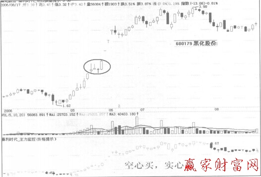 黑化股份图中出现了一轮大力度上涨,上涨时可以看到,涨停大阳线不断地出现,除了龙头股还有什么股票可以形成如此强劲的走势?涨停大阳线向投资者提示了黑化股份的龙头地位。