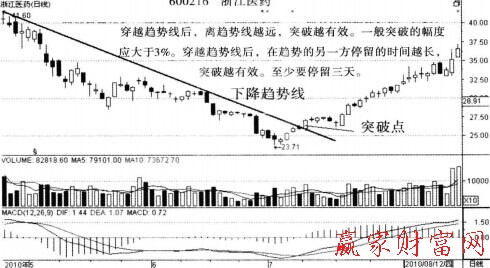 当股价经过长时间的下跌后,沿着各个逐步步移的高点划出一条下降趋势线,股价如能放虽突破下降趋势线涨升,为买进信号。下降趋势线形成的时间越长,准确率越高。突破成交量如能持续放大,后市走势将更理想。如图所示。
