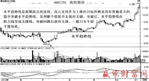 股价长时间运行,每次上冲到某一个价位,都受阻回调,把这若干个高点连接起来,便形成一条水平的趋势线。当股价在某一天放量突破这条水平的趋势线时,视为买进信号;如果未能配合增加的成交量往上突破的话,意味着换手不够积极,有可能突破后不久即再跌同这条趋势线以下。如上图所示。