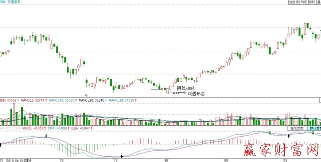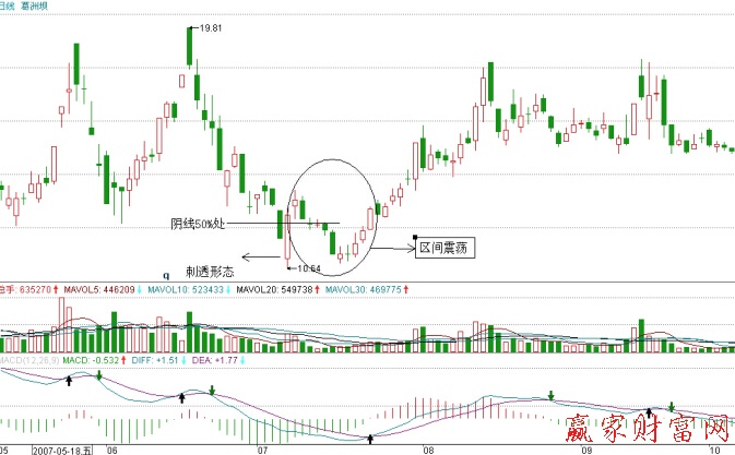 刺透形态出现后,第二个交易日股价并未大幅上涨,而是在随后的几个交易日内对这根快速上扬的长阳线进行了修正。在经历了在阳线实体内的区间震荡后.股价选择了向上突破。其后又经历了一次失败的乌云盖顶再一次上冲,完成了此次的上涨.此次刺透形态引发了5.23元、76.35%的涨幅。相关文章推荐阅读:K线图解突破缺口分析技巧