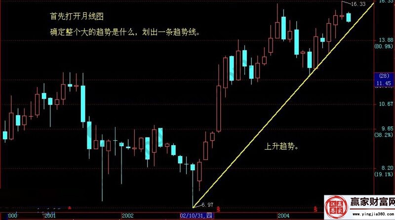 上图是上港集团的月线走势中的历史走势,图中黄色的线就是趋势线,我们可以看到,黄色的线确定了整个大的趋势方向。所以这第一步就是打开月线图,画出一条趋势线,确认出整个大的趋势。紧接着投资者就可以从时间周期上在看月线图,如下图所示。
