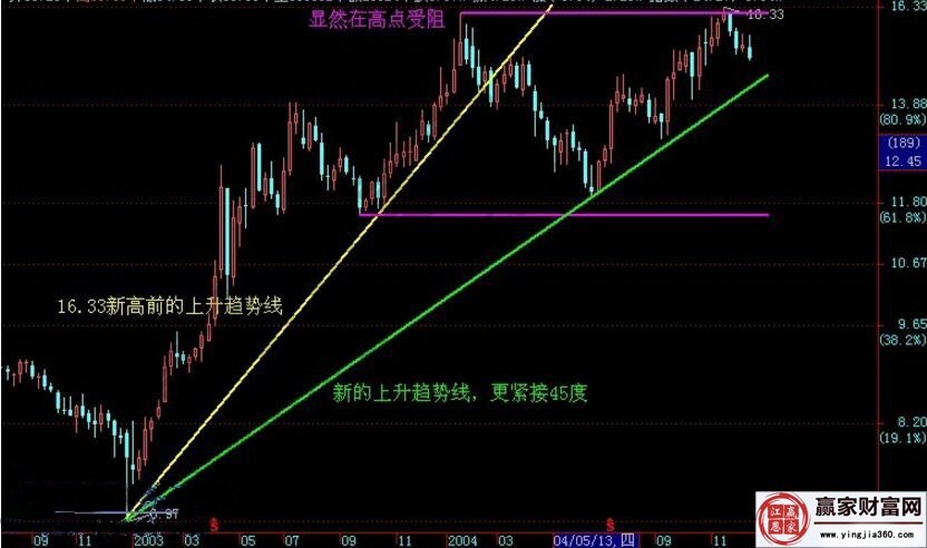 从周线图上,我们可以看到该股面临高点的回调,并且出现了流星与空头吞噬的K线形态,我们在运用趋势线的方法对该股进行分析,来确定是否与月线上的走势吻合,要做的就是画出趋势线(如下图),然后寻找这个趋势变动的过程,该股上探压力位置后,就可以把它定义为短期横盘整理,长期上依旧是上升趋势,而中期趋势就不明朗了,因为它并没有突破高点。