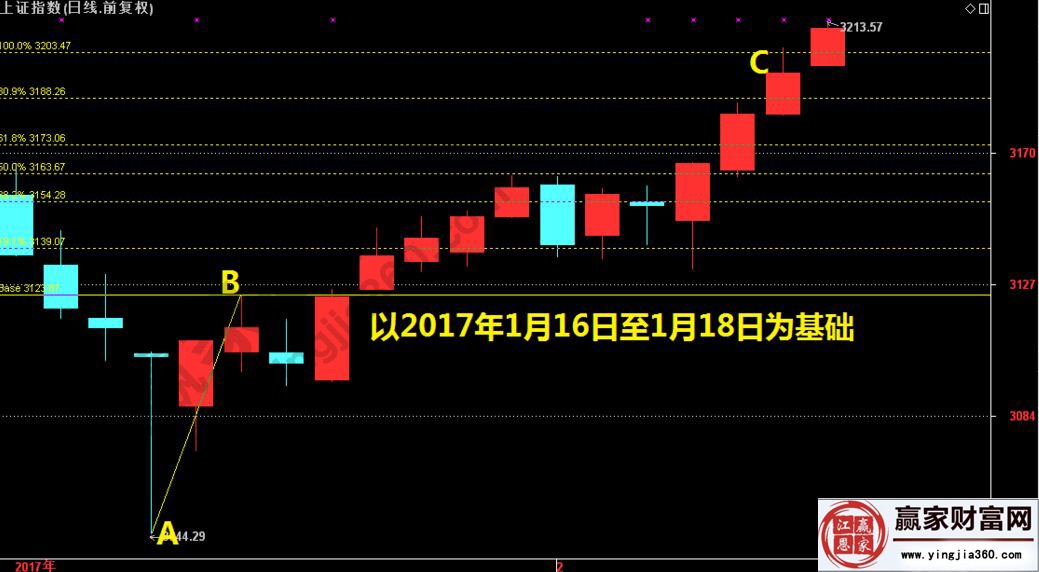 我们以2017年1月16日至1月18日为基础向上扩展,100%线的压力为3203点,上周五正好受到压力,出现上影线。