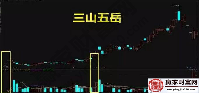 三山五岳K线形态是怎样的?下图是就是一个标准的三山五岳K线形态。具体的就是股价前面出现三个或以上的一字板,在一字板连续拉升以后,市场出现调整,在调整当中出现大阳线,又是在突破前期的过程中出现大阳线,同时这两根大阳线的量能是非常关键的,这样的走势连接起来就好像是三山五岳一样,所以这也是这种模型的由来。