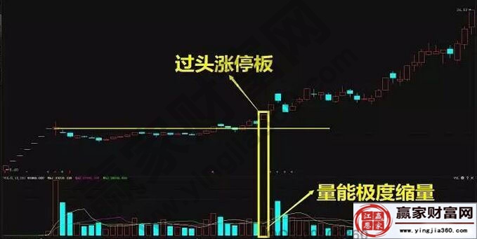⑴K线特征。它是有四根或四个以上K线组成,拉升阶段至少有三个以上的一字板,最后关键位置出现一根或者两根实体涨停,对其它K线的要求并不高(如下图)。连续的一字板上涨表明了有重大的利好或者是蓄势已久,后面的实体涨停有重新发力的意图。