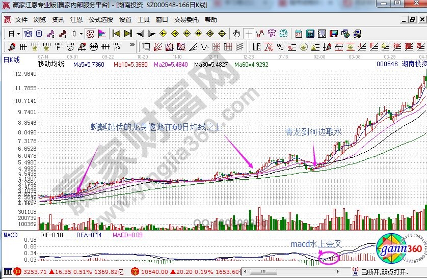 青龙饮水形态是怎么样的?它其实是由均线所组成的,主要的均线就是5日、10日和60日均线。其中最为主要的特征就是5日均线和10日均线呈现的是不断地上下起伏,就好像是龙的身体,日K线图衣服在龙体上就好像是一片一片的龙鳞,而且这样形成的青龙是逶迤在60日均线上的,时间可以长达半年之久,如下面的湖南投资的走势图。