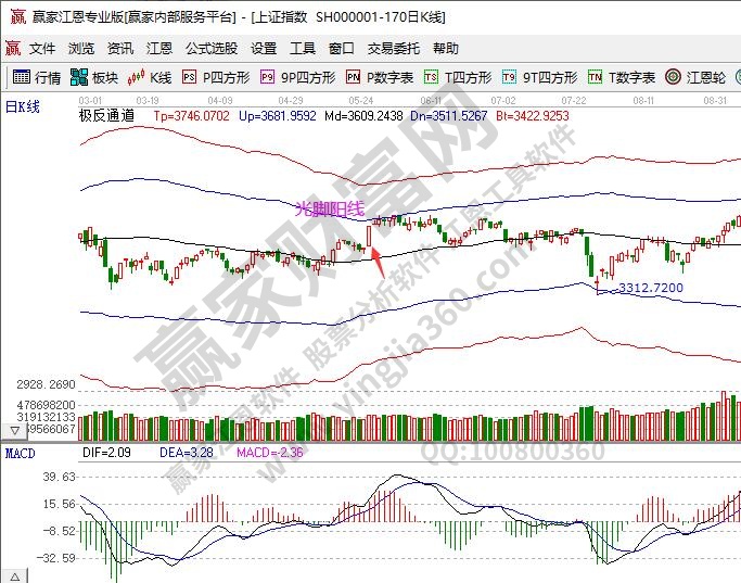 (2)如果这种光脚阳线出现在股价上涨的中间,说明股价在上涨的过程中受到了抵制,说明盘中的一些短线投资者获利了结。如果第二天盘中继续出现大量回撤,说明后期股价会暂停甚至回落。如果第二天盘中回撤逐渐减少,那么这表明市场的股价将继续向上运行。