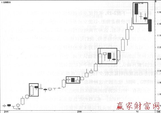 我们来看图中,用包钢股份(600010)2005年12月9日~2006年明17日的价格走势图,以便交易者更容易理解。在图中方框内的价格都是这种没有方向性的状态,我们只有通过后面的价格走势才能知道价格的运动方向,而在当时我们是无法清楚未来的价格运动方向的。因此,我们避免用这种状态确认方向。但是,我们从这张图中可以得到另外一个有意思的启发:如果前面的方向是向上的,那么这种停顿后的方向更可能是向上的。那么只要后面不出现相反的有方向性K线,我们依然可以持有原来的头寸。这种组合也被称做“内包”状态。这就好像是趋势中的盘整状态一样,市场在此做了一下修正喘息,如果没有更大的外力进来,市场通常会延续原来的走势继续运动。如果出现了相反方向的走势,交易者一定要注意,这可能是更强的市场力量正在介入。