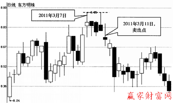 如图所示,东方明珠(600637)的股价从2011年1月下旬开始触底反弹,2011年3月上旬到达阶段性顶部,其中2011年3月7日和10日所收出的K线最高价都是8.95元,从而形成了平顶线形态。成熟的投资者一般会在3月10日形成平顶线的当天使实施减仓操作。