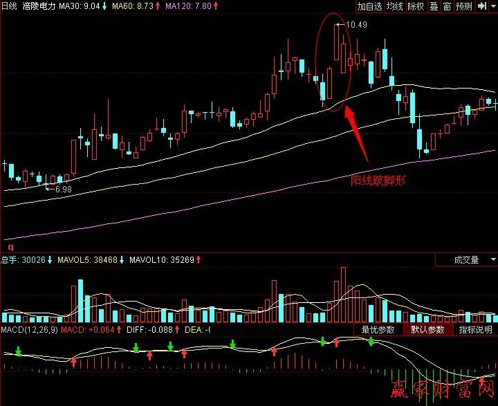 如图显示的是2009年6月3日到2009年9月24日的涪陵电力(600452)的日K线图。涪陵电力的股价经过不断拉升后,出现了阳线跋脚形K线组合,暗示着上档抛压沉重,是一个卖出信号,投资者见此K线图,应及时卖出手中的股票,离场观望。