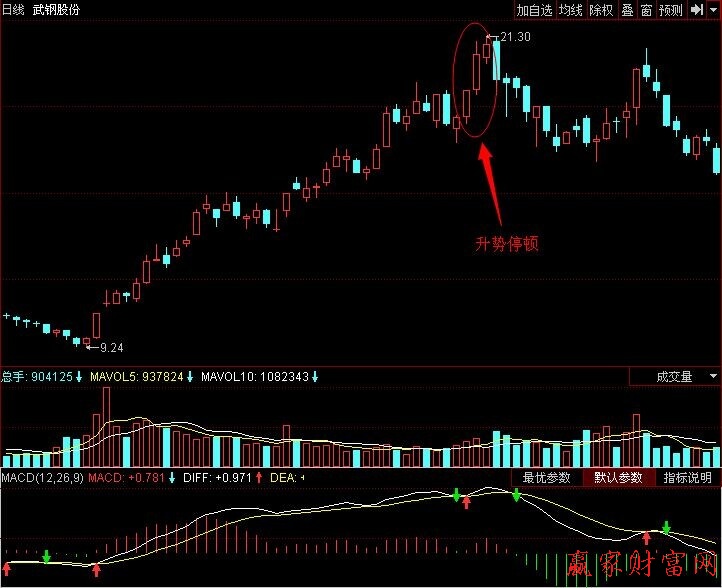 如图显示的是2007年7月13日到2007年10月10日的武钢股份(600005)的日K线图。武钢股份的股价经过多次拉升后,拉高到21.30元,接着出现了升势停顿,几线组合,表明做多的后续力最己经跟不上,股价随时会出现回落。投资者见到该K线组合,要保持等惕,及时清仓离场。