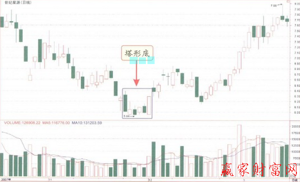 1.塔形底K线组合右边的大阳线若伴随成交量的放大,则反转更可信。