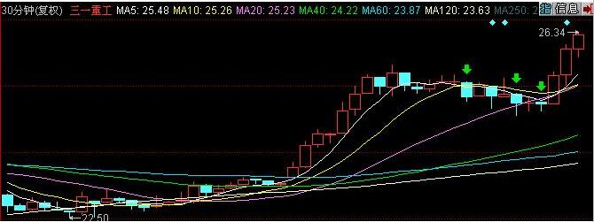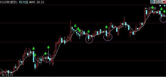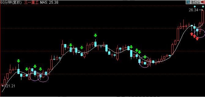 如图三一重工的60分钟K线走势形态,股价从21.21的价格向上拉升,期间经历了多次的三阴战法洗盘形态,图中用绿色箭头标注的都是三阴战法的洗盘K线形态,其中仔细研究其走势可以发现,每次经历一次洗盘形态,后期的股价走势都会形成一波新的上涨行情,其中在出现第三次洗盘的时候,股价已经是处于相对底部,之后股价沿着均线向上拉升,是一种牛股的上涨形态。