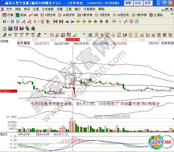 如图光华科技(002741)在2016年6月14日前后的日线走势变化,股价在6月8日涨停突破极反通道生命线,在13日、14日形成了“双剑霸天地”的K线形态,预示着短期内的上涨操作行情,对应的量能放大,macd指标的红柱线不断的拉长,投资者可以积极的布局买点;