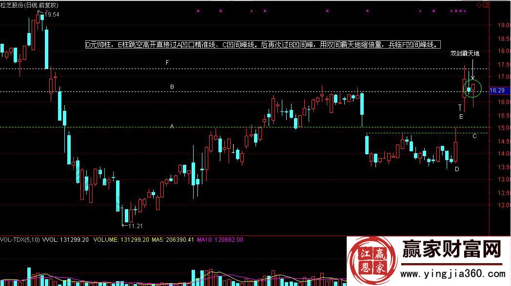 如图该股在2016年6月中旬的走势变化,经过一段时间的横盘走势,在D处形成元帅柱,E点向上跳空拉屎,回踩精准线,在6月13日,14日形成双剑霸天地的K线形态,投资者可以考虑低位的介入点。