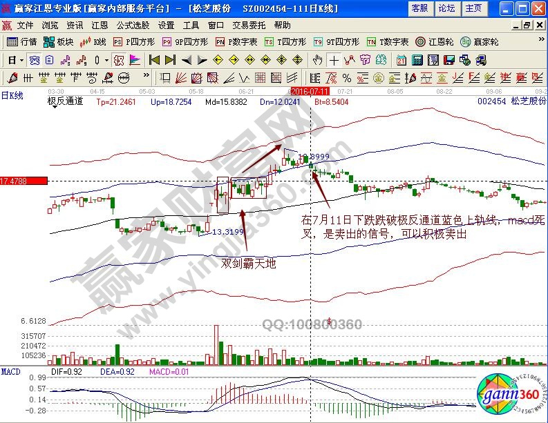 此后,在极反通道中进行分析,股价在蓝色上轨线下方短暂横盘,之后一路上涨,在7月11日下跌跌破极反通道蓝色上轨线,macd指标出现死叉,是卖出的信号,投资者可以积极的考虑卖出获利。