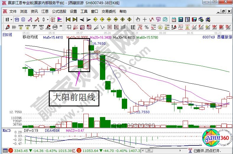 上面的西藏旅游走势就形成了非常典型的大阳前阻线。一般来说在出现这种形态的时候,就是一个大跌的前兆。该形态的主要的特征具体如下: