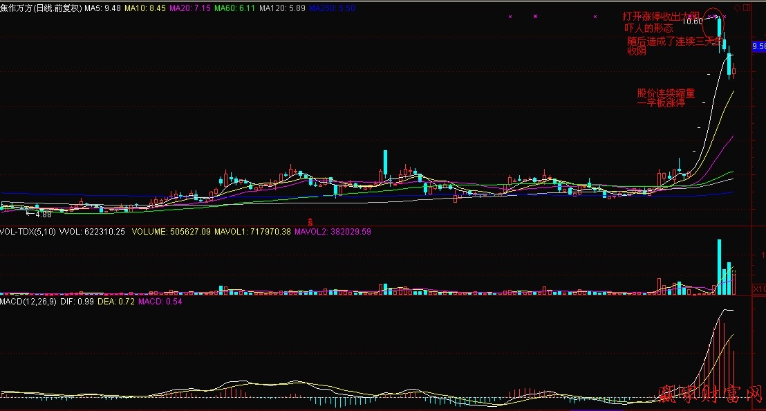 上图中个股复牌后出现了连续的一字板缩量涨停。由于前期是缩量的,所以一旦个股打开涨停时肯定会放出天量。由于个股的连续大幅暴涨,所以MACD出现了快速的在零轴上发散向上形态。个股打开涨停后,成交量当天创下天量,但是最终当天收出了一根带有较长下影线的阴线,股价没有实现涨停,所以第二天会出现一定的恐慌性抛盘,第二天继续放量下跌,但是MACD整体趋势向上,却也出现了拐头向下的形态。