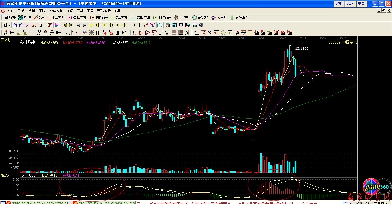 4.分析MACD柱状线,由红变绿(正变负),卖出信号;由绿变红,买入信号