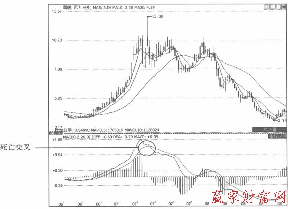 1.图1所示是四川长虹(600839)的周K线图和周线MACD,其股价以过大幅拉升后,只出现一次高位死亡交叉,而这一次死亡交叉一出现就宣告行情结束。所以在这种情况下,买进股票,持股待涨,直到周线MACD出现死亡交叉后卖出股票,成本就会翻几番。